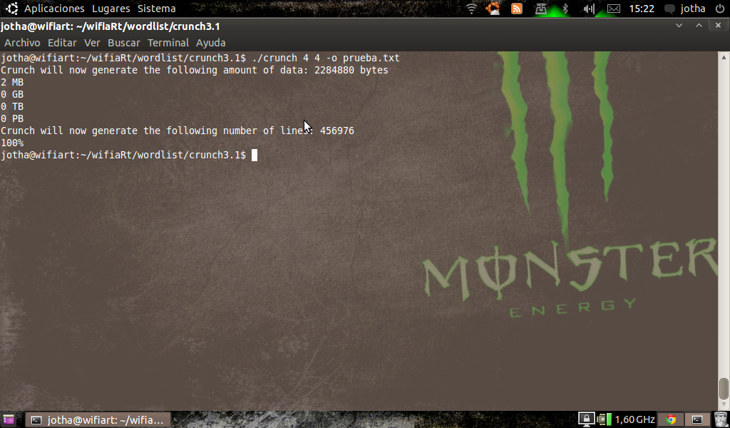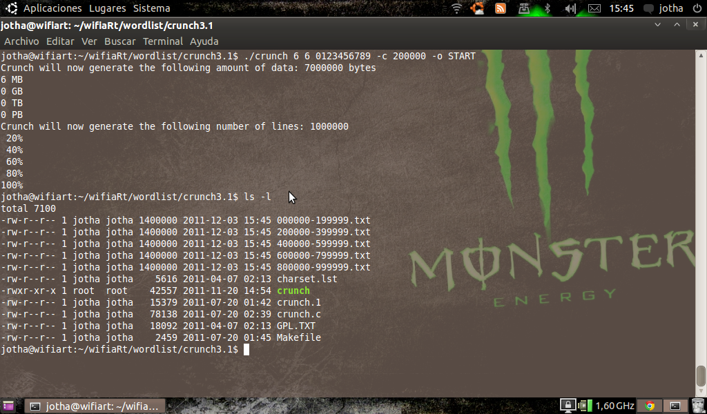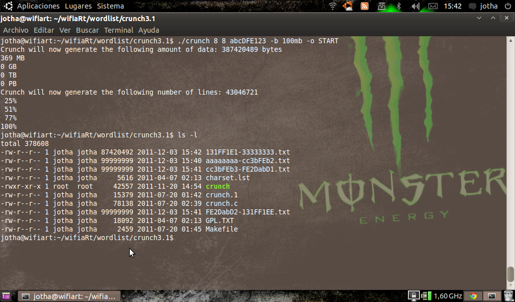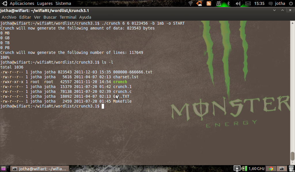 Para instalarlo descomprimimos y hacemos sudo make y si lo queremos instalar hacemos sudo make install pero el directorio de instalaciín sera /pentest/crunch/ por lo cual yo recomiendo que lo dejemos alojado en una carpeta para tenerlo mas a mano ( los usuarios de Backtrack solo tienen que poner sudo apt-get install crunch para tenerlo instalado ).