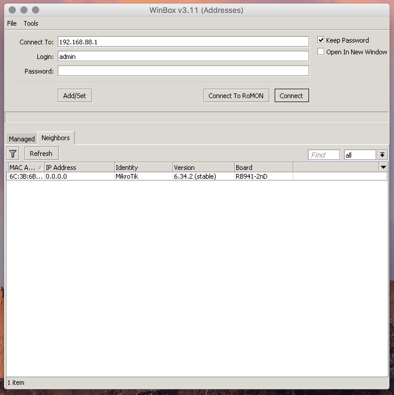 • Ya no vas a poder acceder por IP a WinBox, vas a tener que acceder por MAC hasta que configures correctamente el equipo: You are not allowed to view links. Register or Login