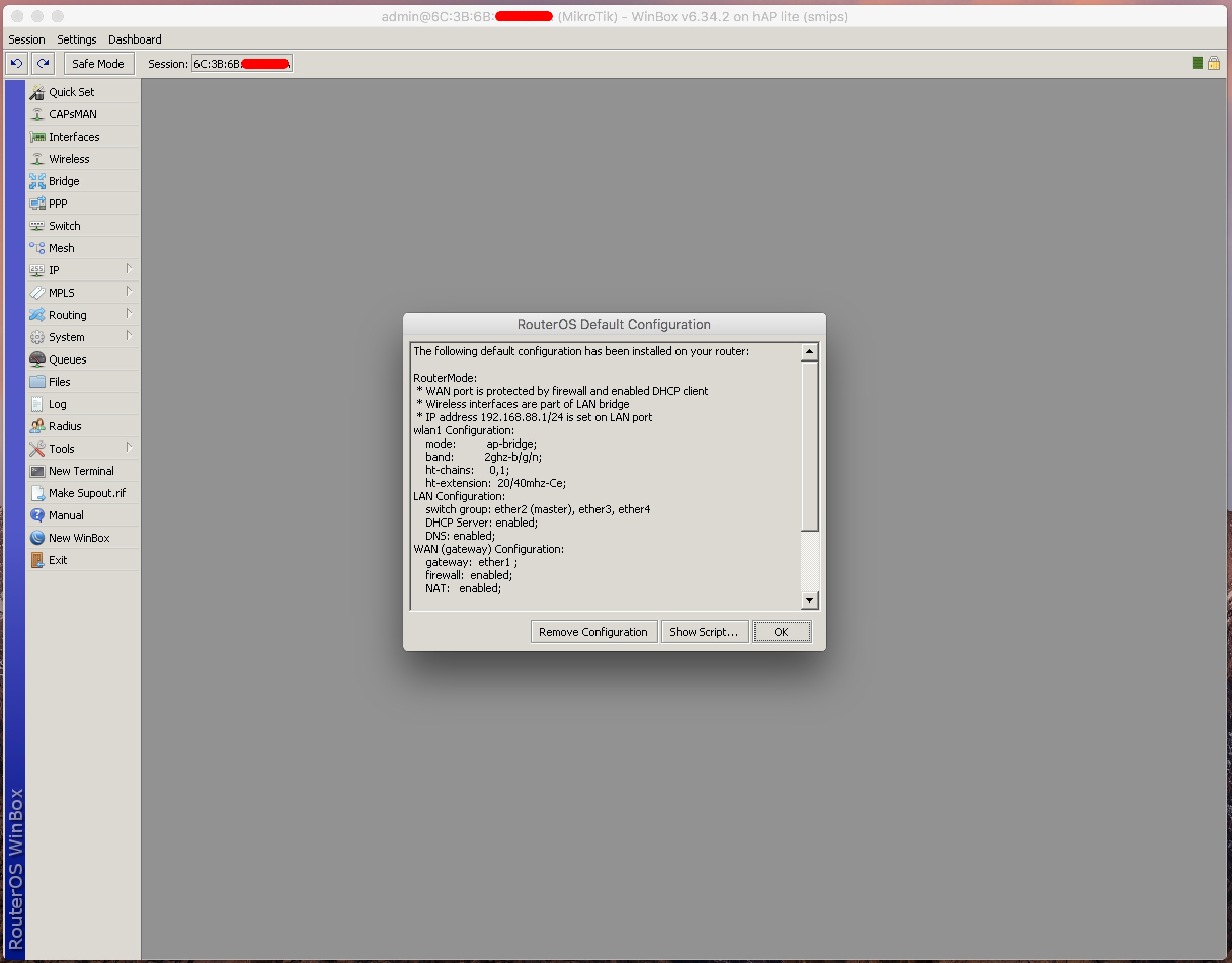 • A la pantalla principal, dale clic en "Remove Configuration" para empezar de 0. Si ya no te aparece, andá a "New Terminal" y pegá este código: /system reset-configuration